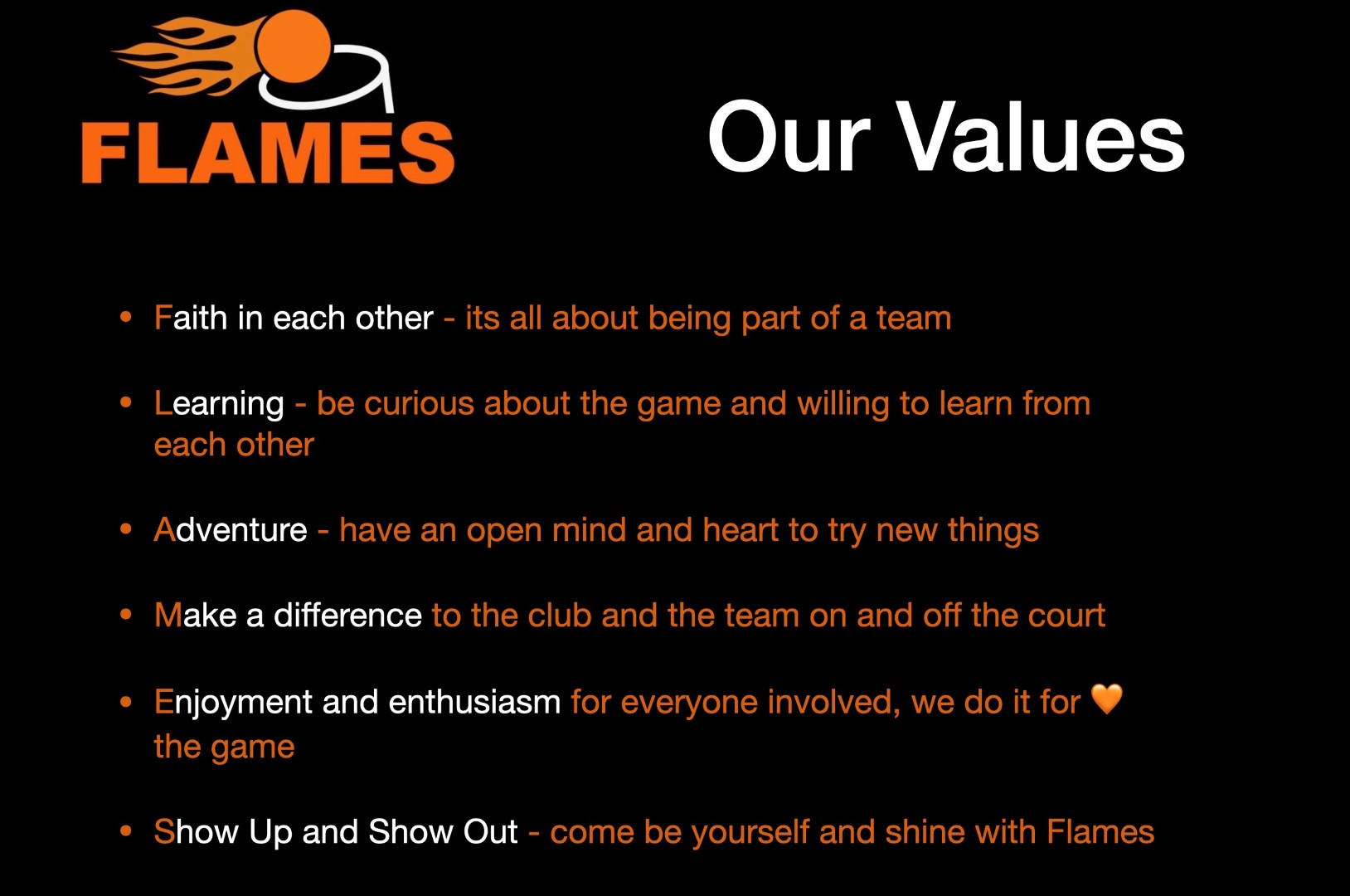 Flames: We're a Club, we're a team. From every player, umpire, and supporter, we're a team. We win together and we lose together. We celebrate and commiserate together. Defeats are softened and victories are sweetened because we did them together. We are Flames